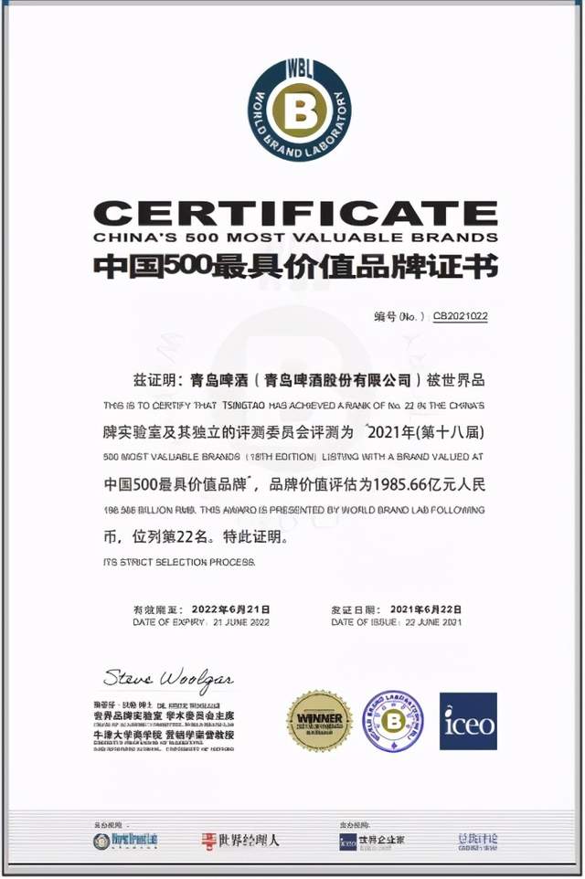 这是世界品牌实验室(World Brand Lab)连续十八年发布《中国500最具价值品牌》。自该榜单诞生以来,有着118年历史的青岛啤酒,连续十八次蝉联中国啤酒行业品牌价值桂冠,让青岛啤酒这块“金字招牌”在时间的洗礼和检验中熠熠生辉。