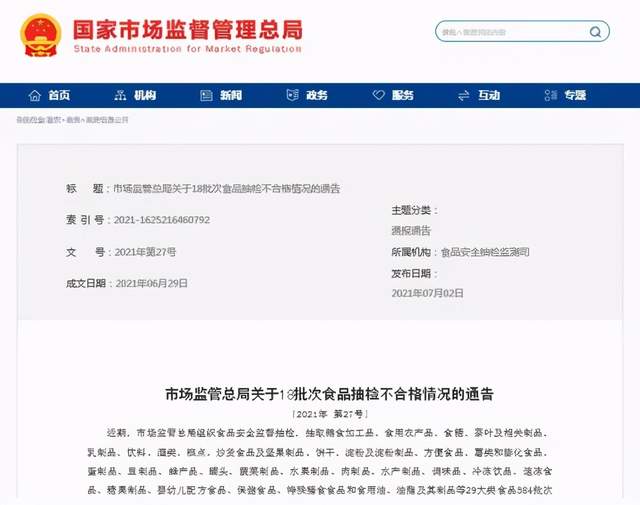 对抽检发现的不合格食品,市场监管总局已责成相关省级市场监管部门立即组织开展核查处置,查清产品流向,督促企业采取下架召回等措施控制风险;对违法违规行为,依法从严处理。