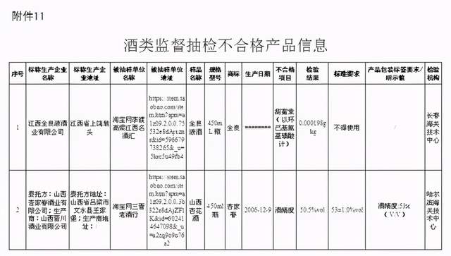 此外,淘宝网三晋老酒行在淘宝网店销售的、标称山西杏家春酒业有限公司委托山西晋川酒业有限公司生产的山西杏花酒,被检出酒精度含量不符合产品标签标示要求,标称53度的产品,实际酒精度为50度。